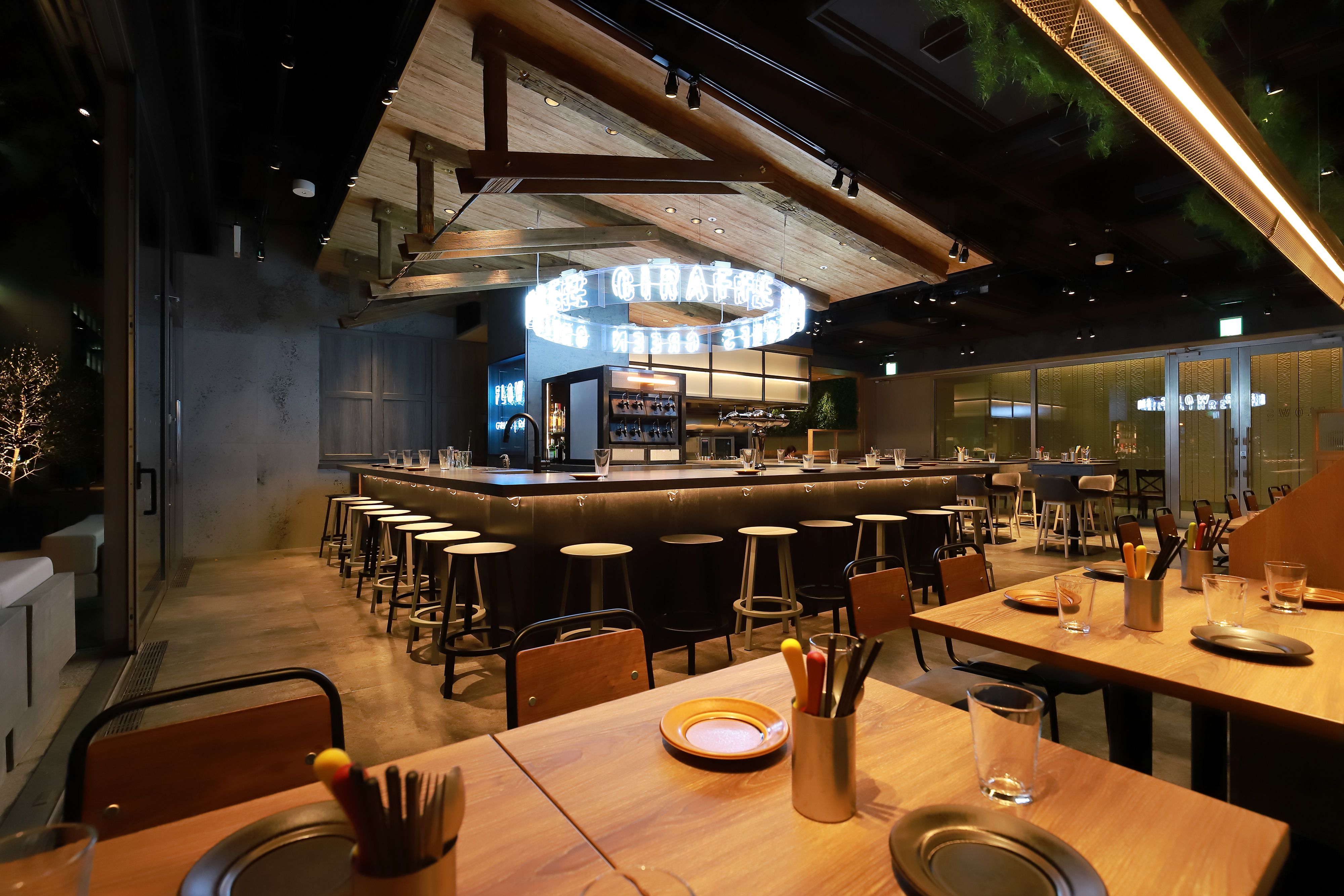 9月10日に中野セントラルパークサウスに新店舗、『FLOWS GRILL | BAR』がオープンしました! 店内の中心にある目を引くサークル型のバーカウンターには「タップ・マルシェ」が設置されており、FLOWSで取り扱っている19種類のクラフトビールの中から日替わりで8種類のビールが楽しめるようになっています。 そんなクラフトビールを存分に楽しめるメニューが「ビアフライト」という飲み比べセットで、4種類・8種類と選べ、旅行気分で各地のクラフトビールを楽しめるメニューとなっています。 ビールから立ち昇る煙がユニークなスモークビア、自家製のコーディアル(シロップ)で作るサワーなどもおすすめですよ。 クラフトビールと一緒に楽しみたいのが、素材の味を引き出したシンプルかつエキゾチックなグリル料理たち。 こちらは個性の強いクラフトビールに合わせ、スパイスやハーブをふんだんに使用したインターナショナルな料理で、クラフトビールの銘柄を変える度に料理にも変化が生まれるよう趣向を凝らしたものです。 また、お昼時のランチメニューに加え、スムージーやデザートメニューもありますので、カフェ利用として楽しめるのも嬉しいポイントですね。 中野四季の森公園から流れ込むグリーンや空気感が漂う店内で、おいしいドリンクやフードを楽しみながら、質の高い時間を過ごしてみませんか? 中央のカウンターの頭上のネオンをじっくり見ると、FLOWSのアナグラムで“WOLFS”という単語が隠れていますよ。 FLOWSのアナグラムから生まれたオオカミ(WOLF)のキャラクターが店内のいたる所にいますので、是非探してみてくださいね。 ● FLOWS ● http://www.nakano-centralpark.jp/food/s12