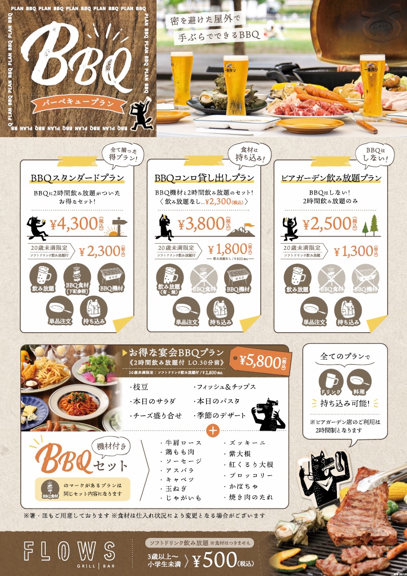 中野セントラルパークでは3月22日(予定)から、屋外BBQができます! BBQプランがあるのは『FLOWS』『me at park』『GOOD MORNING CAFE』の3店舗。 店舗によってBBQプランの違いがありますので、順次店舗ごとにご紹介させて頂きます。 《FLOWS》 ●お得な宴会BBQプラン (コース料理(6品)+BBQセット(食材&機材)+飲み放題) ・大人 \5,800 ・6歳~19歳(ソフトドリンク飲み放題付) \2,800 ・3歳~5歳(ソフトドリンク飲み放題付) \500 ●BBQスタンダードプラン (BBQセット(食材&機材)+飲み放題) ・大人 \4,300 ・6歳~19歳(ソフトドリンク飲み放題付) \2,300 ・3歳~5歳(ソフトドリンク飲み放題付) \500 ●BBQコンロ貸出プラン 飲み放題付 (BBQ機材+飲み放題) ・大人 \3,800 ・6歳~19歳(ソフトドリンク飲み放題付) \1,800 ・3歳~5歳(ソフトドリンク飲み放題付) \500 ●BBQコンロ貸出プラン 飲み放題なし (BBQ機材貸出) ・大人 \2,300 ・6歳~19歳(ソフトドリンク飲み放題付) \800 ●ビアガーデン飲み放題プラン (飲み放題のみ) ・大人 \2,500 ・6歳~19歳(ソフトドリンク飲み放題付) \1,300 ・3歳~5歳(ソフトドリンク飲み放題付) \500 ※BBQプランの当日予約OK 予約やBBQプランの詳しい内容については、店舗にお問合せください。 【FLOWS】03-3228-6088 https://www.nakano-centralpark.jp/food/s12 当イベントは、新型コロナウイルス感染症対策を実施した上でイベントを開催いたします。